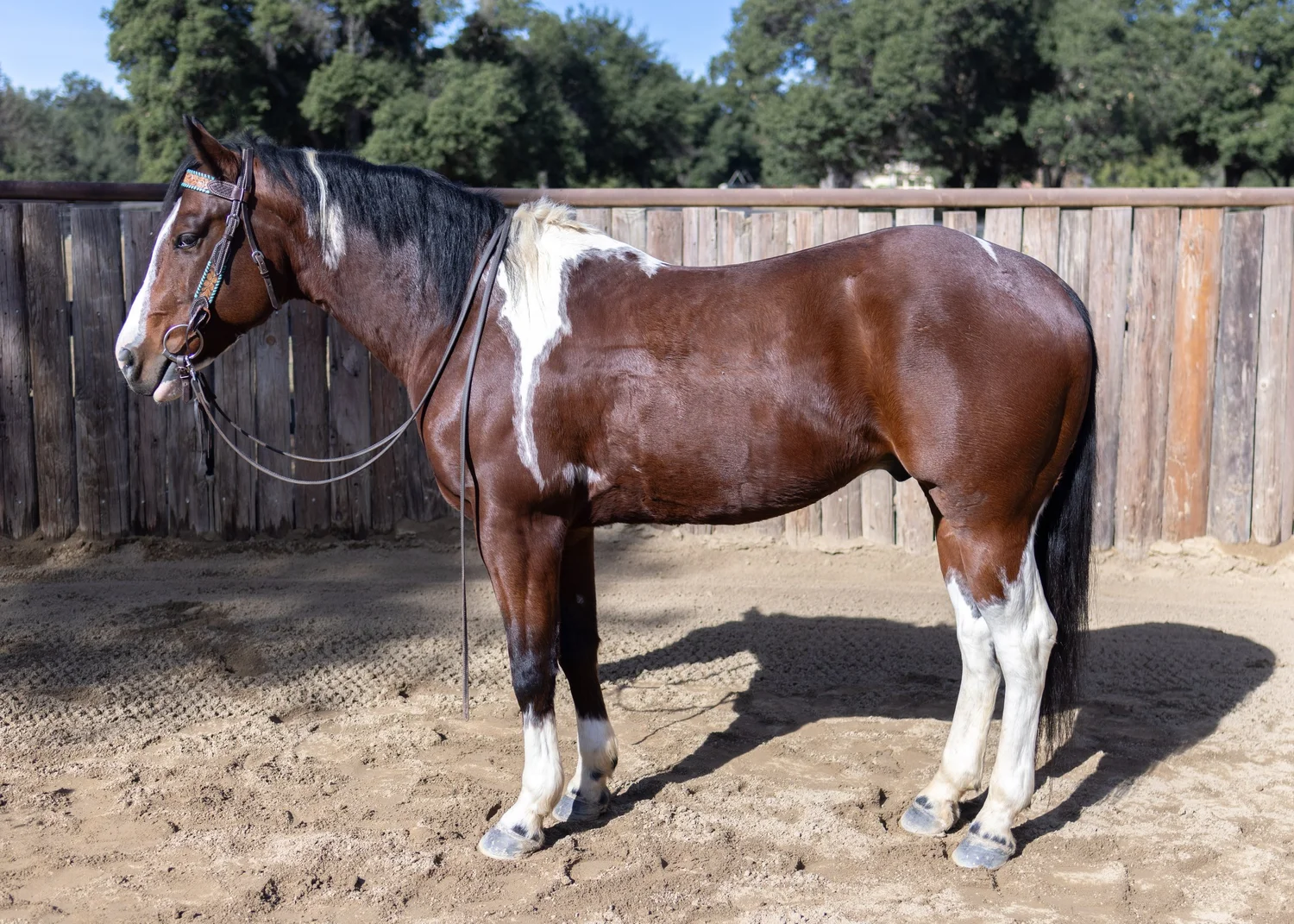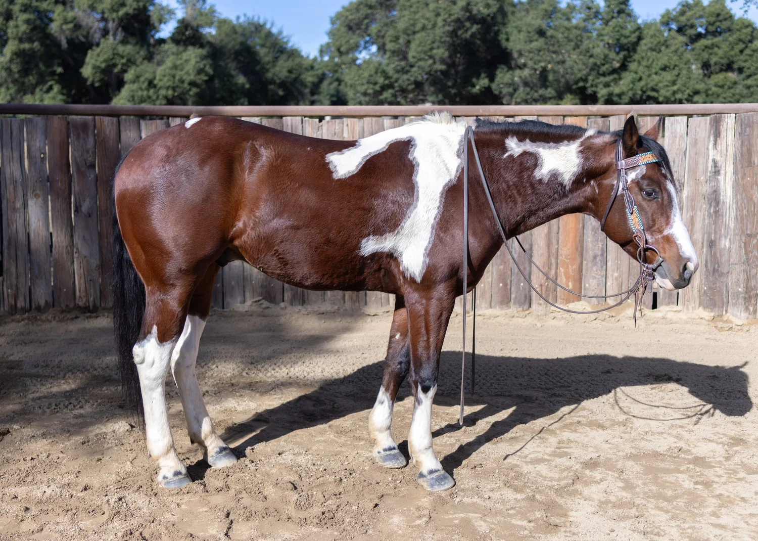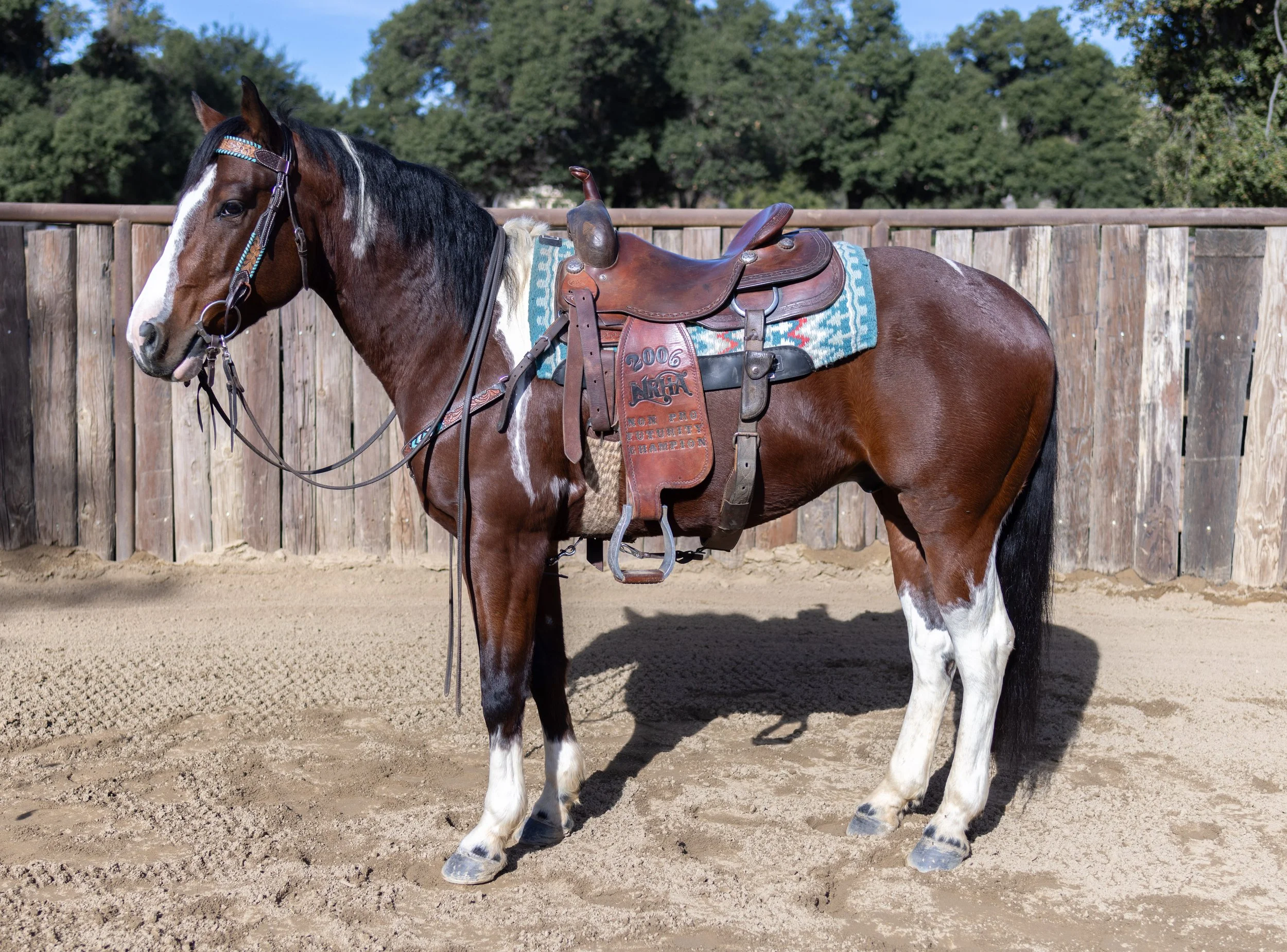 Falcon is a 5 year old Bay Paint Gelding, just plain incredible for a young horse and easily one of our favorite horses in the barn. He has been hauled extensively, been trail ridden everywhere, spent a lot of time doing all of the ranch chores and is equally happy working in the arena. He is whip smart and has a great attitude which makes him very easy to train. He has shown us that he can do anything we ask of him and is incredibkly reasonable about requests he doesn’t quite understand. Falcon is about as bombproof as we can expect a 5 year old horse to be.